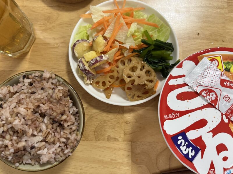 • 昼:代表メニュー(きつねうどん+雑穀ごはん+サラダ数種) …… 約780kcal