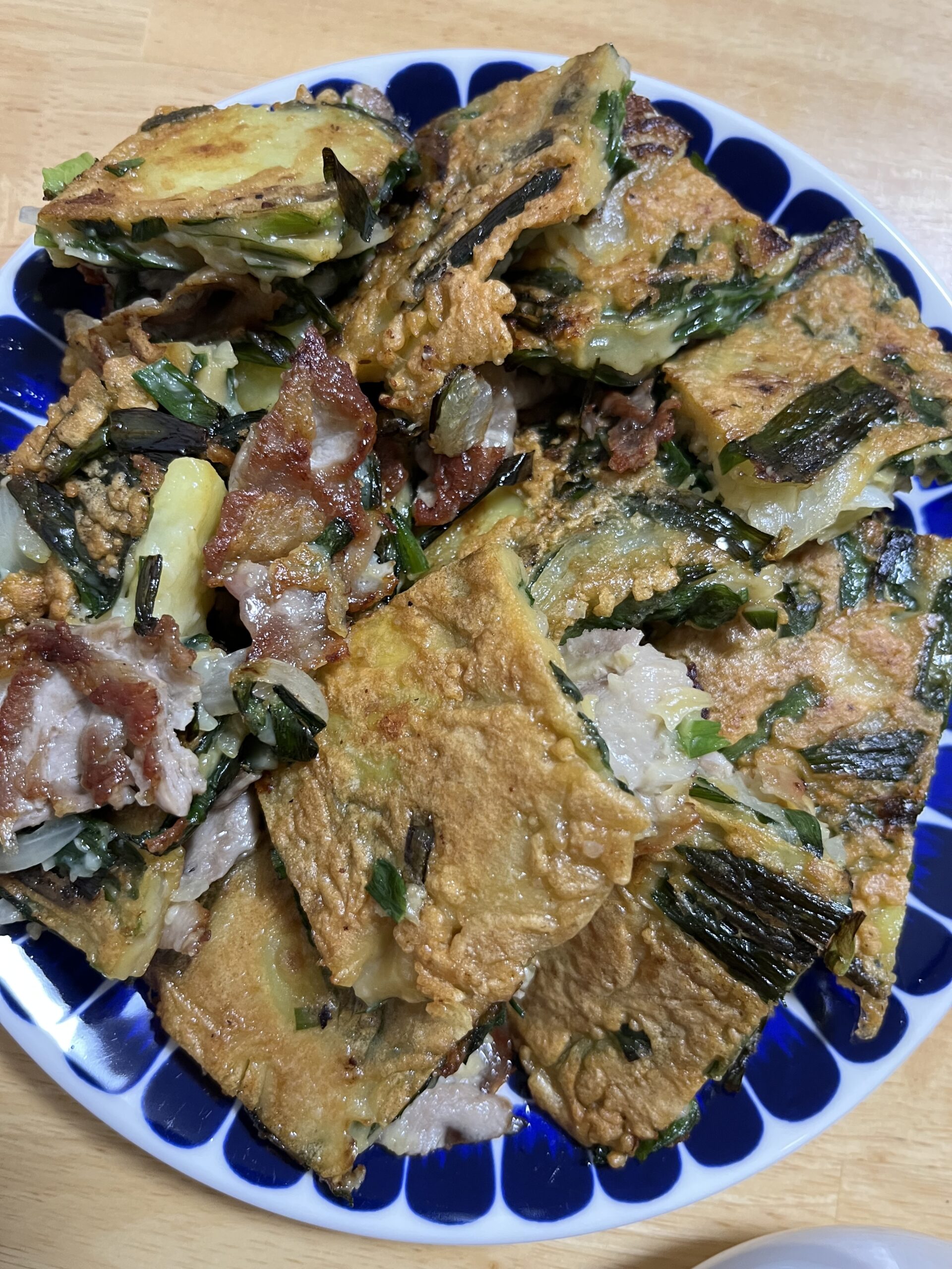 ニラ・玉ねぎ・豚バラ入りチヂミ大きめ1枚の1/2約420kcal