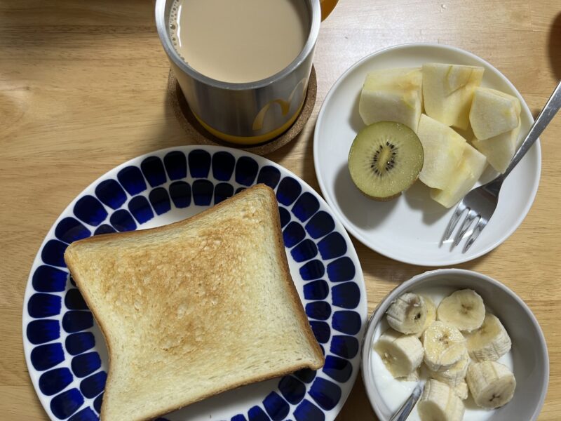 朝:トースト+バナナヨーグルト+果物+カフェオレ …… 約470kcal