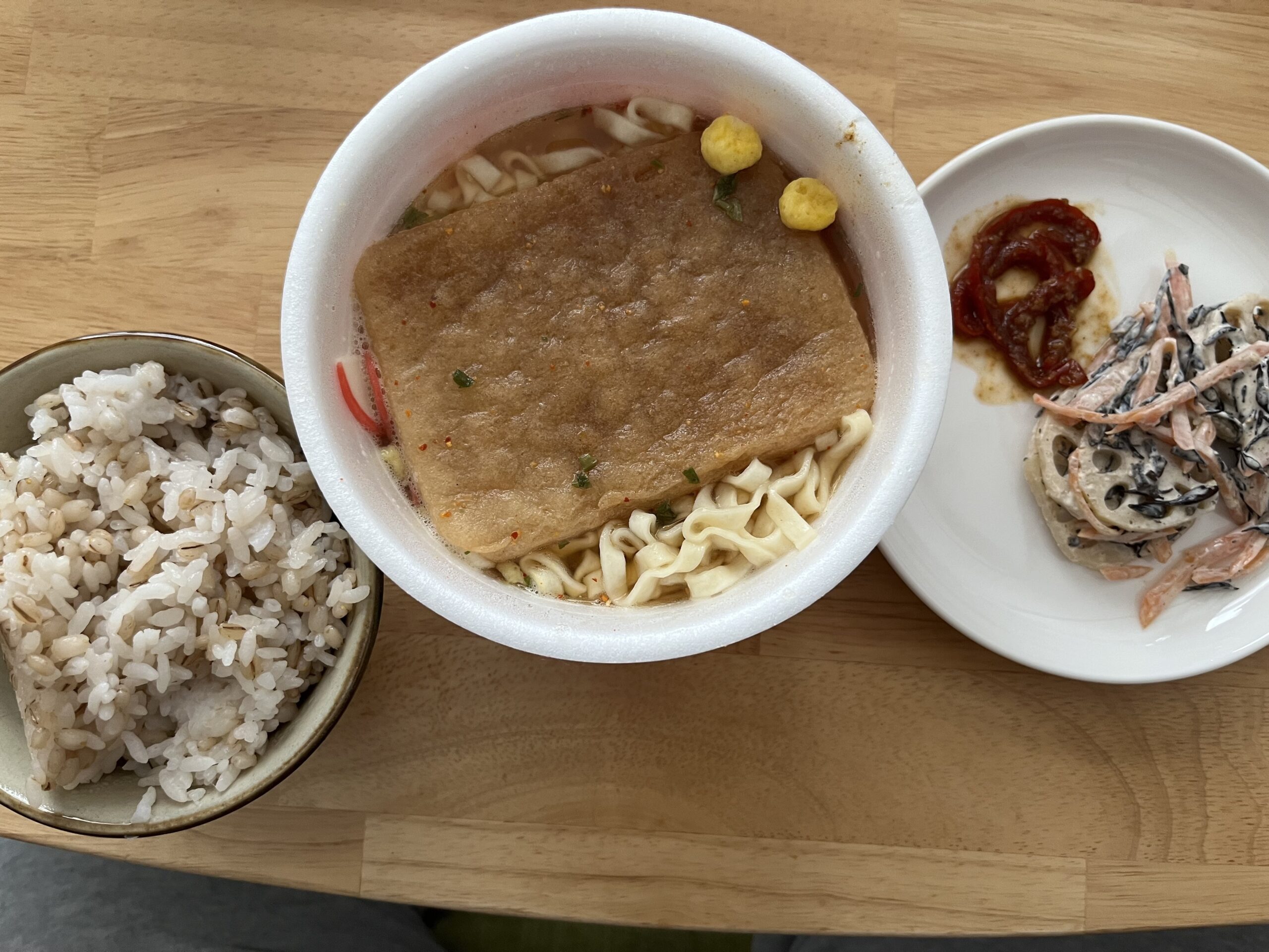 昼:赤いきつね+もち麦入りごはん+副菜 …… 約760kcal