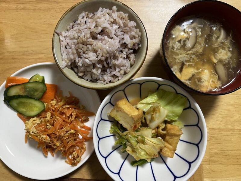 • 厚揚げで良質なタンパク質を確保しつつ、キャベツで食物繊維を補給。炒め油の分を考慮します。約 280 kcal