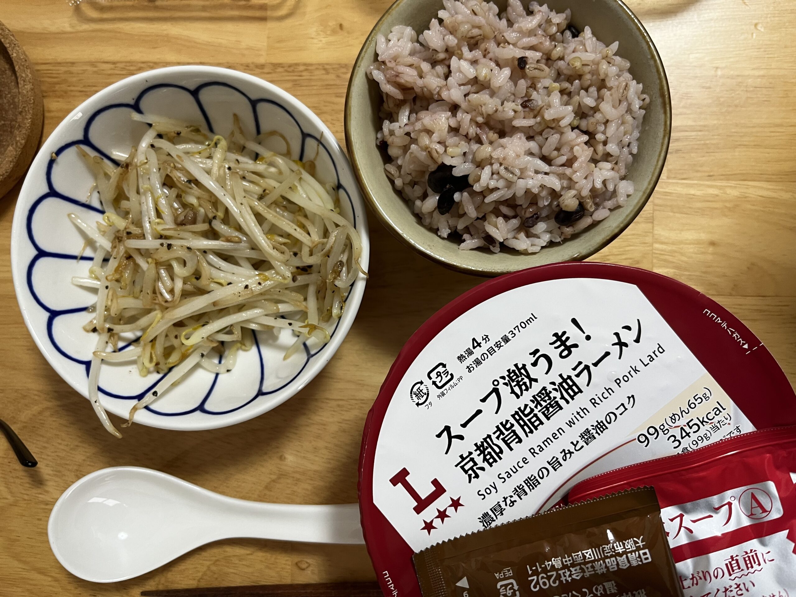 • 昼:代表メニュー(カップラーメンと十六穀ごはん) …… 約620kcal